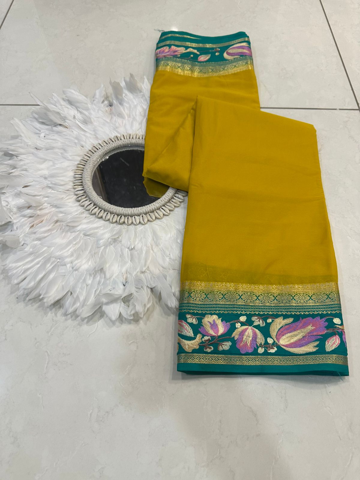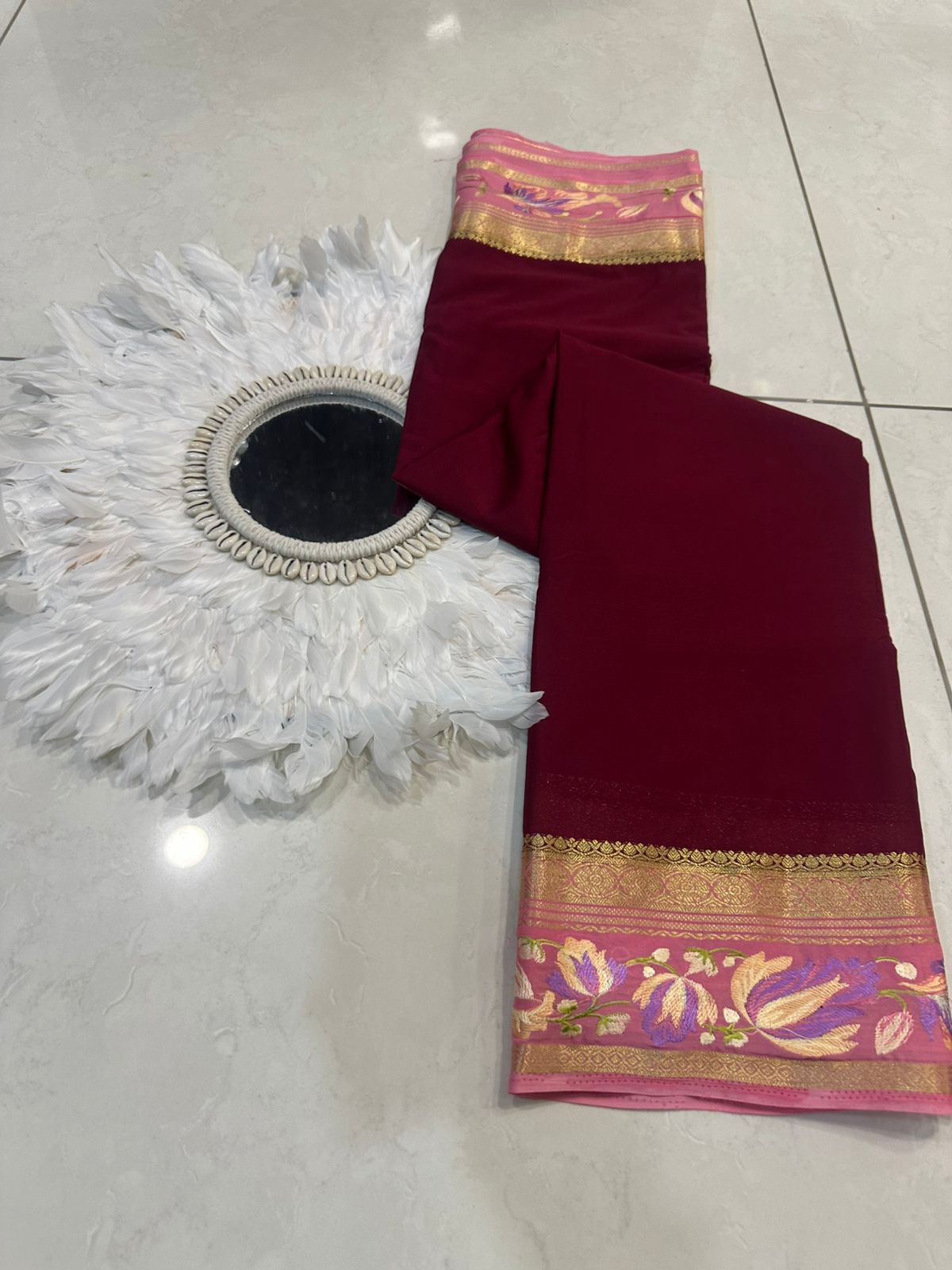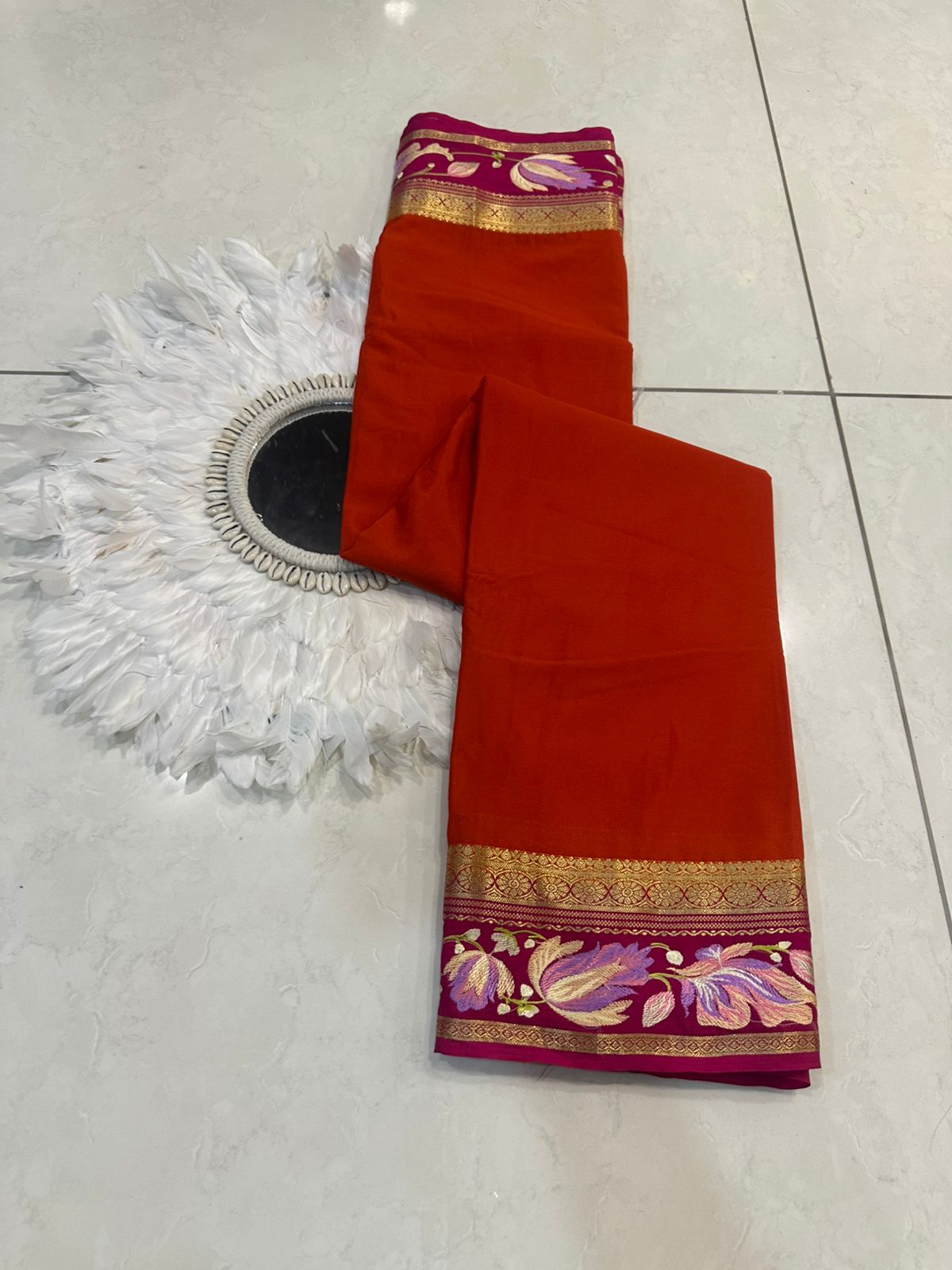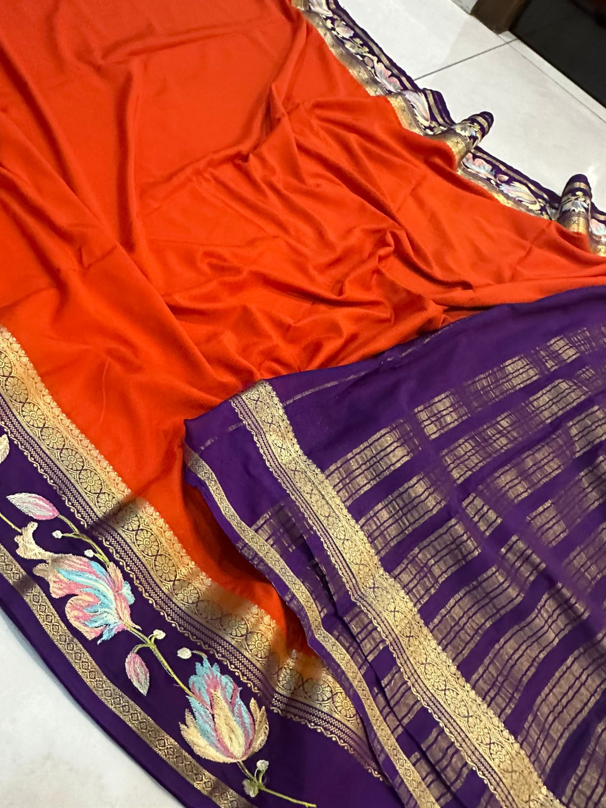 Beautiful Mysore silk sarees with contrast embroidery borders and contrast blouse